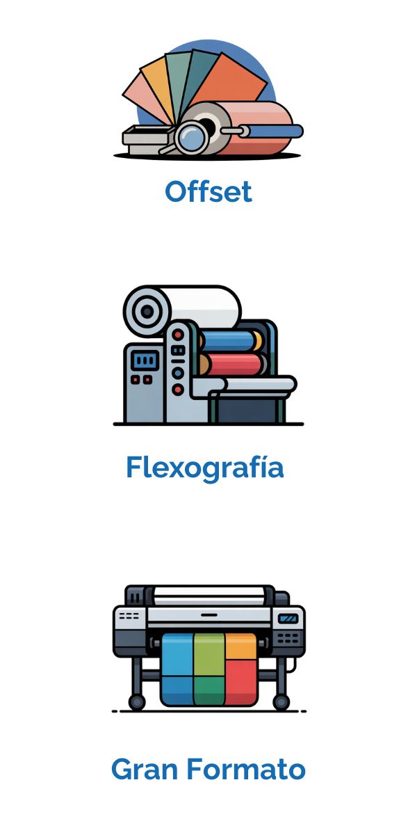 Optimizamos tus procesos de offset, flexografía y gran formato con tecnología de punta y soporte local.